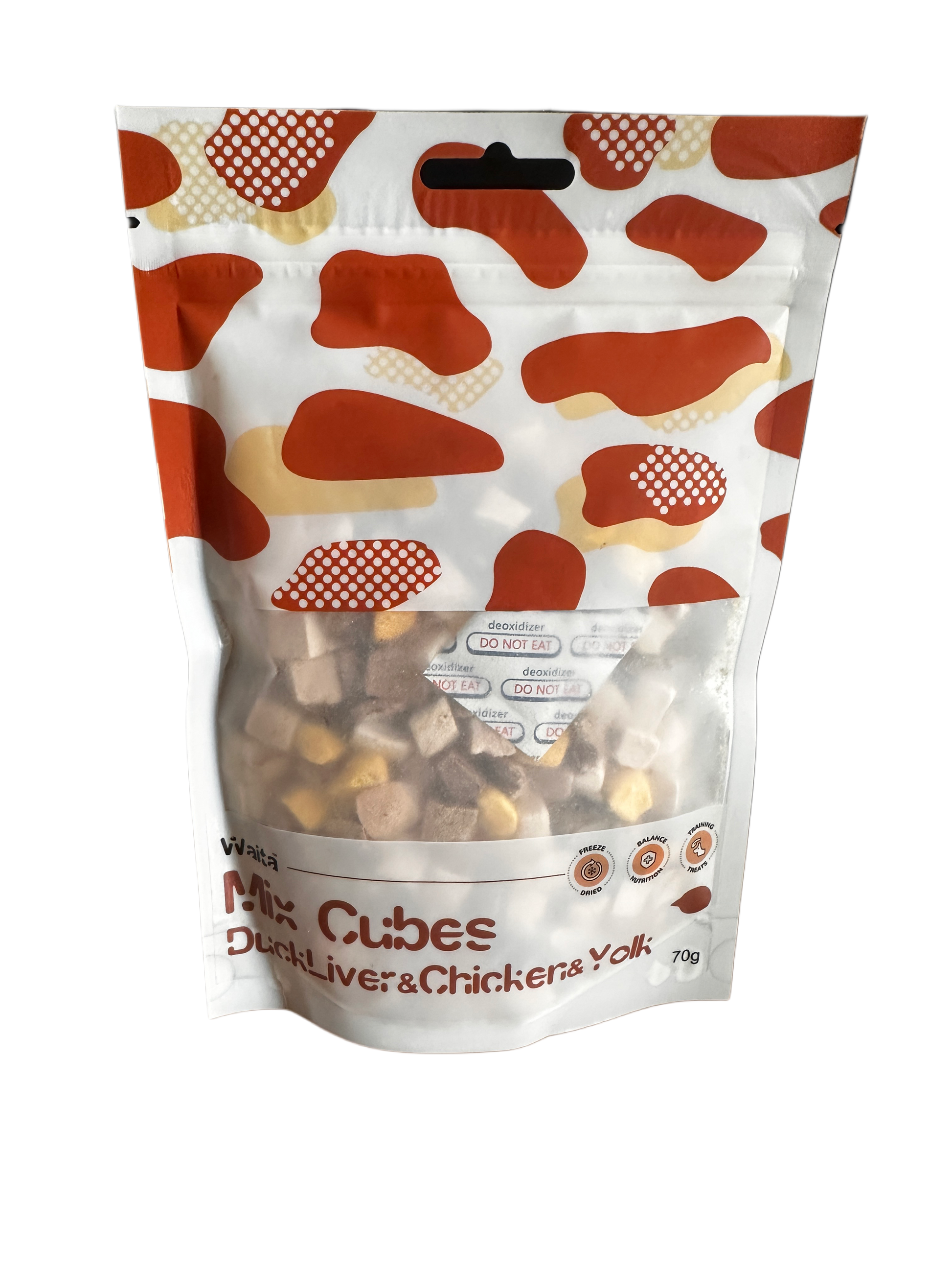 A mix collection of freeze dried cube treats, including 20g Chicken Cubes & 25g Duck Liver Cubes & 25g Egg Yolk Cubes. Provide verified nutrition and protein.