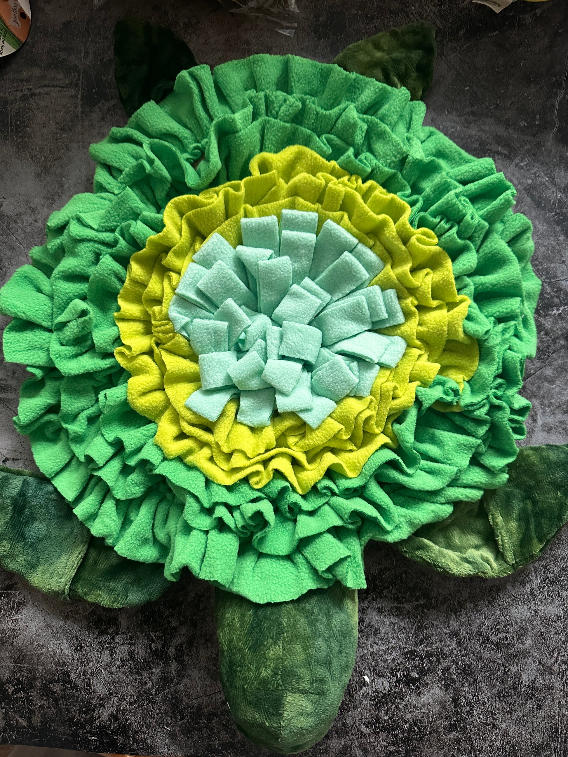 Expertly designed for dogs, cats, and rabbits, the Sea Turtle Snuffle Mat offers an interactive and engaging way to slow down feeding, relieve stress, and enhance foraging skills. This mat features a turtle design, built-in squeaker, crinkle paper, and hidden pockets for a multi-sensory experience. Its anti-slip base and soft fleece material make it perfect for brain stimulation and mental enrichment without the need for batteries.